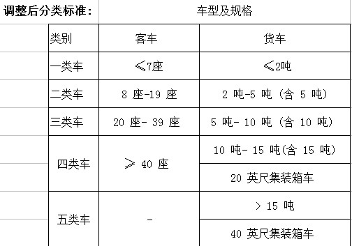 如車(chē)頭高度小于1.3米,座位數(shù)大于或等于8的小轎車(chē)由原一類(lèi)車(chē)上升為二類(lèi),收費(fèi)上升;車(chē)頭高度大于或等于1.3米的,但座位數(shù)小于7座的面包車(chē)和小型客車(chē)由原二類(lèi)車(chē)下調(diào)為一類(lèi);2軸6輪,10座及以上、19座以下的中型客車(chē),19座大型客車(chē)由原三類(lèi)車(chē)下調(diào)為二類(lèi),收費(fèi)下降。