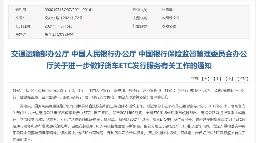 11月15日,交通運(yùn)輸部辦公廳、中國(guó)人民銀行辦公廳、中國(guó)銀行保險(xiǎn)監(jiān)督管理委員會(huì)辦公廳聯(lián)合發(fā)布《關(guān)于進(jìn)一步做好貨車ETC發(fā)行服務(wù)有關(guān)工作的通知》: